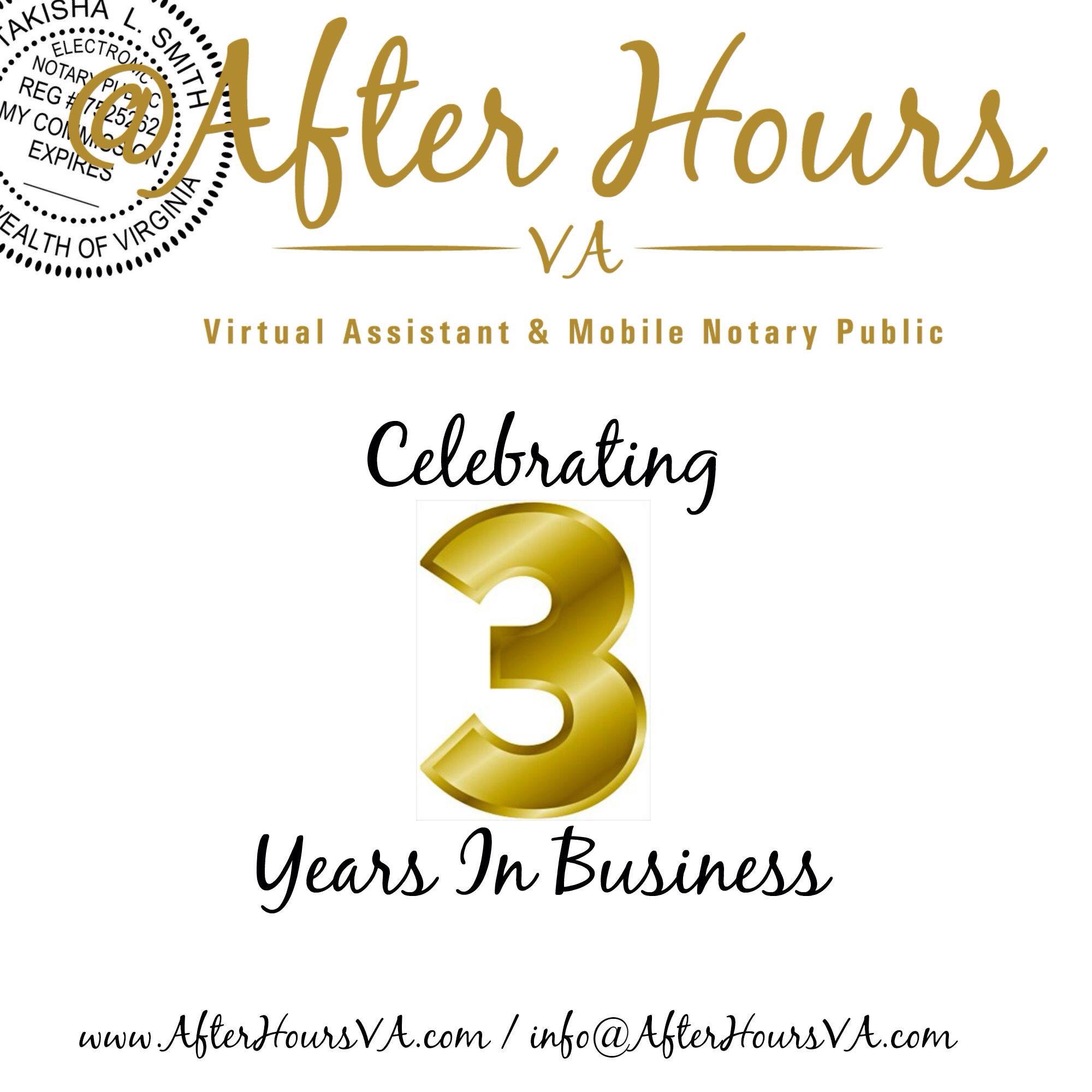September 18, 2012 marks the official start of @AfterHoursVA. Three years ago after obtaining my notary commission, I had a vision of starting a part time mobile notary business. Literally I jumped up that day and filed my DBA, obtained a business license, applied for an EIN and purchased a domain.